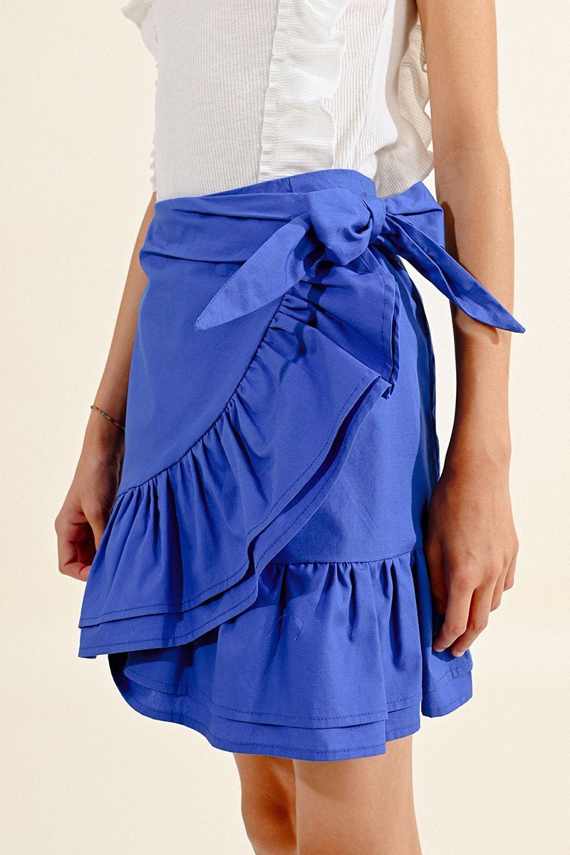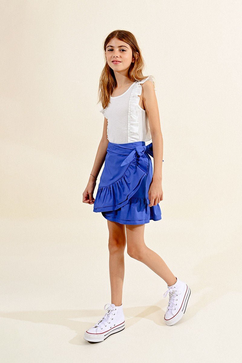 We love this mini wrap skirt with a little asymmetrical flounce on the front. Length : 37cm Size 12 ans -5cm<12ans<+5cm