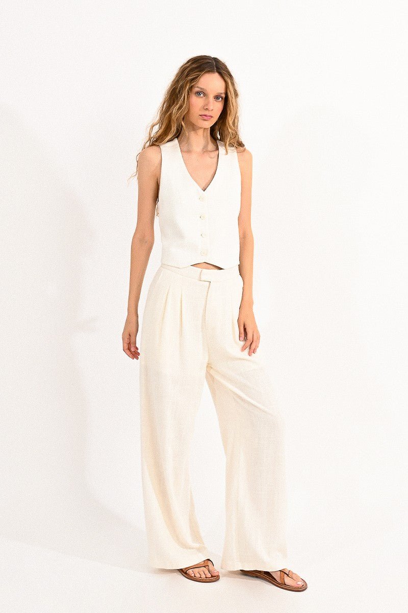 Fitted sleeveless linen jacket with back tie Length : 46cm Size S