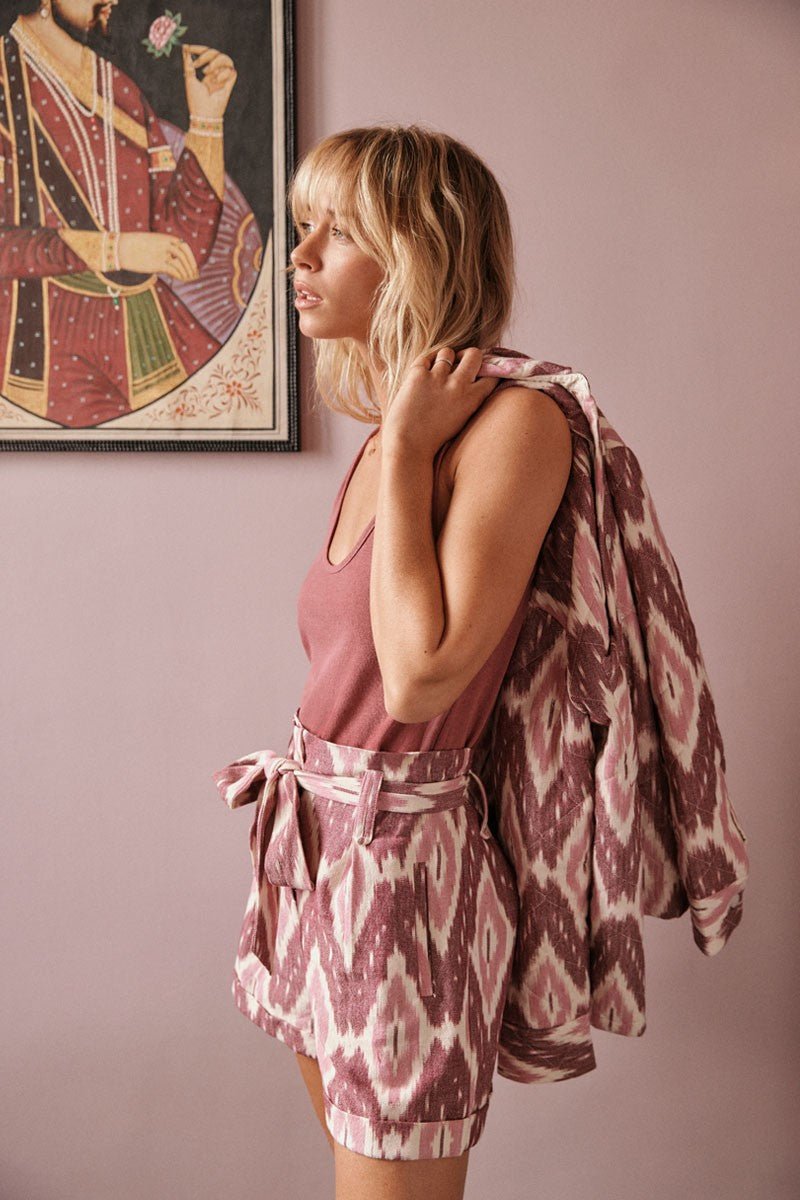 We love its high waist, cotton shorts with batik motif, tie belt and side pockets, zipped front closure. Length : 41cm Size S
